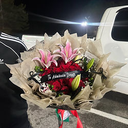 This product includes 36 long stems, with the choice option of (PINK RED OR WHITE ROSES FOR FREE) and 2 Lily's and greenery on rim. The Add ons includes, a custom ribbon message tissue & bows, that will highlight your luxury arrangement