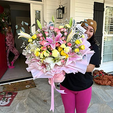 This arrangements includes stunning 5 Star gazer Lilies pink and white, carnations, eucalyptus baby breaths & roses up to 75 flowers Also has custom ribbon, wrapping & luxury dramatic wrapping. This arrangement includes wet foam with flower food. No need to remove flowers from wrapping.